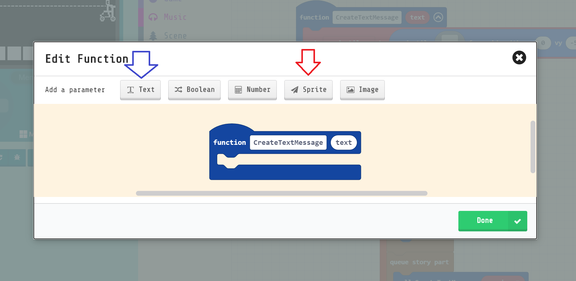 @richard; is there anything simple we can do for something like this? There’s no way after a function is created for a user to know if the param is a sprite vs text or number; I can’t think of a way to differentiate them (besides e.g. prefixing with the type or a symbol indicating type). I guess at least we could provide hover text on the parameters in the function creation dialog, so there’s a way for us to instruct people to check?