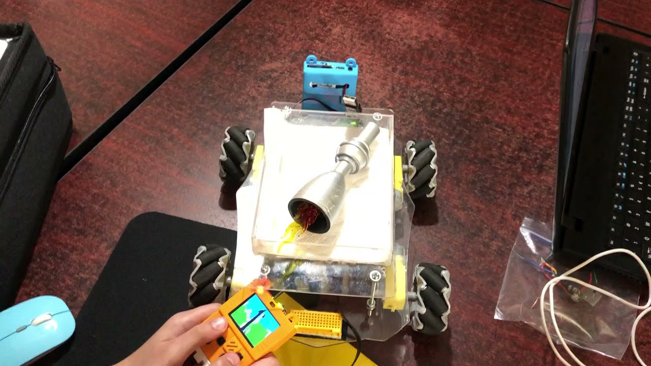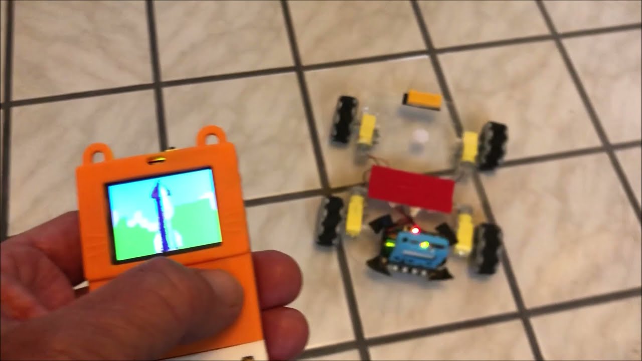 Video: I’m posting this under Arcade because it is really not Micorbit, we now have 2 Arcade consoles communicating with a wireless protocol to drive a roller-bearing wheel ‘transporter’. This allows up-down-left-right button press for a full range of movement of the robotic car. Mecanum wheels allow lateral and diagonal movement of the car. We also add ‘story’ extension to give instructions to the player. In addition we add picture sprites and backgrounds from Pedersen’s utility convert image to sprite to make the experience more meaningful. Because Meowbit has analog sensors (we have shown temperature, light level and tilt) we can now teach both digital input and analog input for computer science. The Kittenbot power expansion board called Robotbit is well mated to Christina Zhang’s Meowbit so that we have the potential of connecting servo, dc motors as shown, stepper, I2C and other sensors,outputs for electronics education via an edge connected game console. Code for both Meowbits is in the description of the video: