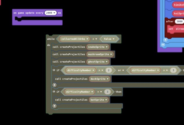 When putting code inside an On Game Update block, the game will not update the screen until the code inside stops running, so you game will freeze entirely until “collected all orbs” is true.
