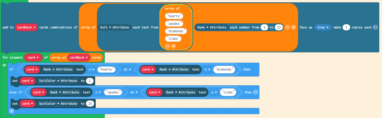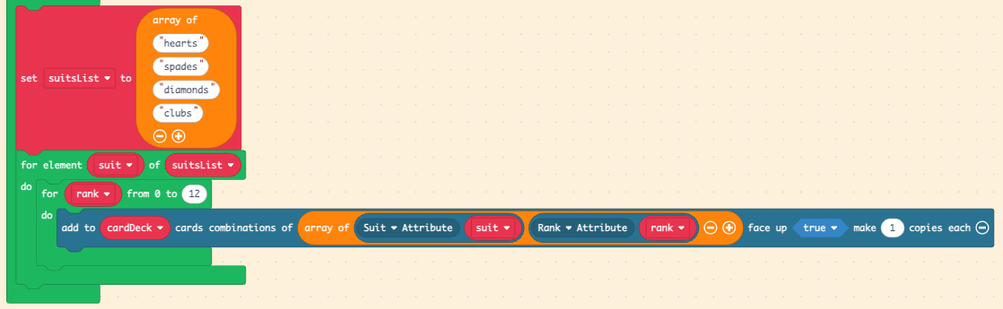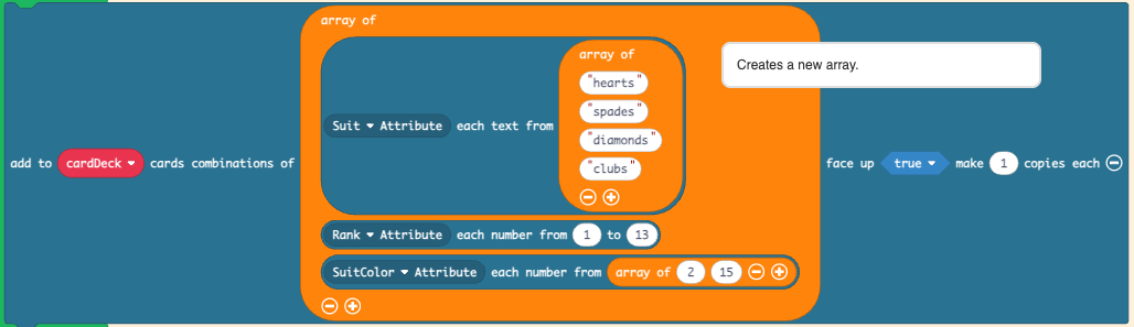 The block would add all combinations between the suits, the ranks, and the suit colors, Meaning you’ll now be adding, in order, a red Ace of Hearts, a black Ace of Hearts, a red 2 of Hearts, a black 2 of Hearts… creating 4x13x2 = 104 cards, including combinations that you don’t want.