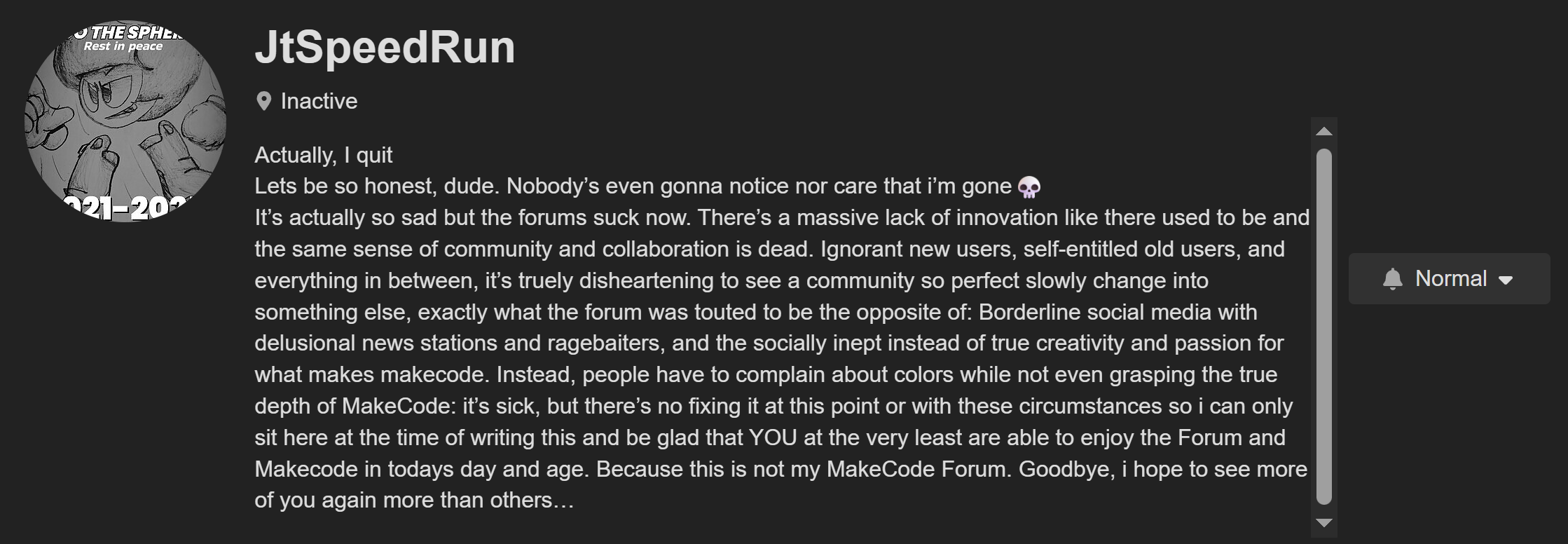 and i hope that we can all take away something important from this. Whether it be to find what you’re actually passionate about creating, striving for excellence in your games or providing genuinely useful help to new users, we should all try to make the forums a worthwhile place to grow and develop, not just having fun connecting and chatting. I want to see more discussions on gameplay mechanics, UI elements, character designs, level designs, lore ideas, colour palettes and so much more things actually related to what goes into making a game yk?