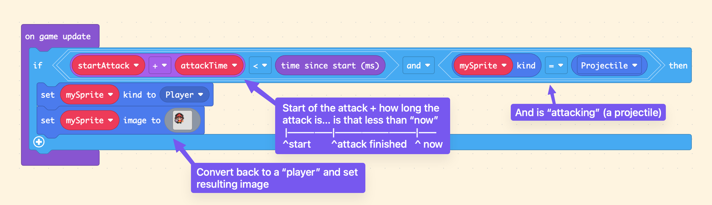 - The large if-check says “has the time where we started the attack + the amount of time that an attack takes passed?” and “is the player currently a Projectile type”