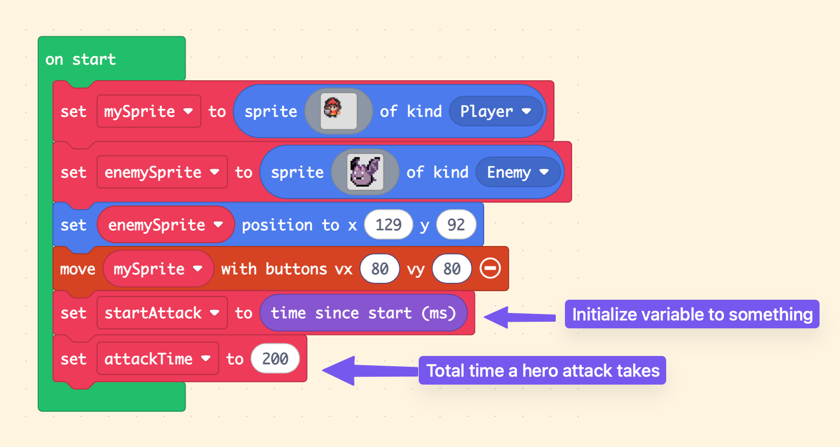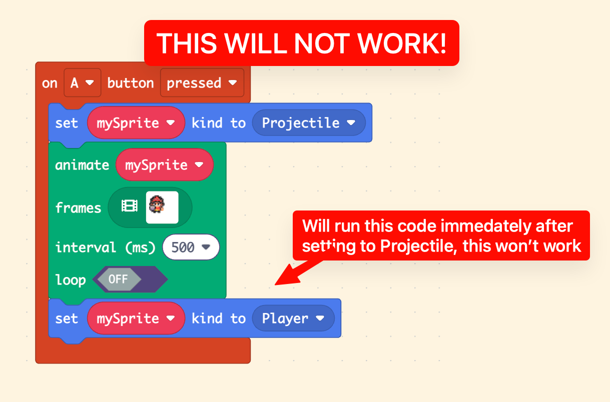 MakeCode Arcade gives us a great “sprite kind” that we can use for this state machine variable.