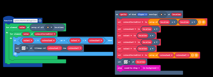 Basically, when the player collects a coin (which is a tile,) the tile is deleted and two values named “coinvalueX” and “coinvalueY” respectively are set to the tile’s x and y values. Then, when the player enters a different room and comes back, this function is loaded to remove the tile.