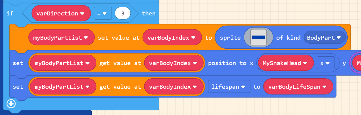 This post is similar to a previous, but slightly different. I am trying to make a version of Snake. I have a system for moving and turning on a 6x6 ‘grid’, but what I want to do is create body parts behind the head as the snake moves about and then have the lifespan, delete the body part as it expires…creating the illusion of a moving body. Easy to do in other engines, but trying to figure out arcade.