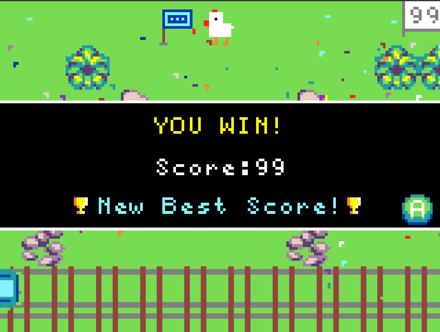 Hi. As part of a school project, I remade the mobile game Crossy Road for fun. It’s extremely simplified compared to the actual game, like for example, you complete the game at a score of 99, and the water logs don’t move, but I’m sharing it in case anyone wants to play it. Have fun!