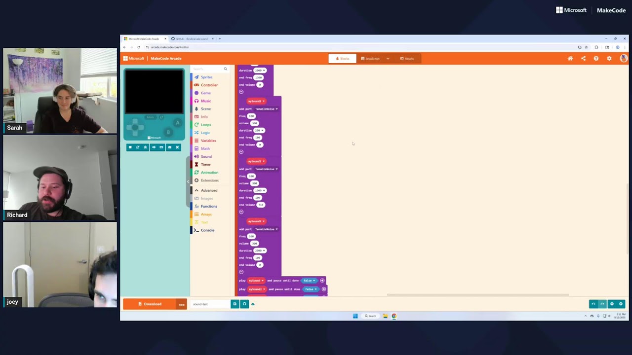 This extension lets you programmatically create sound effects in your game as well as manipulate them in all sorts of fun ways! I haven’t written up documentation on how all of the blocks work just yet, but today on livestream we explained how each of the blocks works in detail. That video is below: