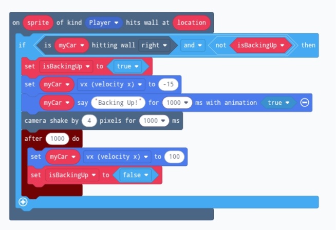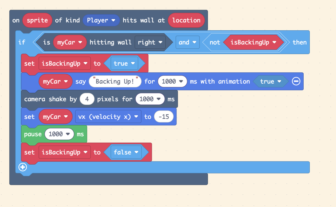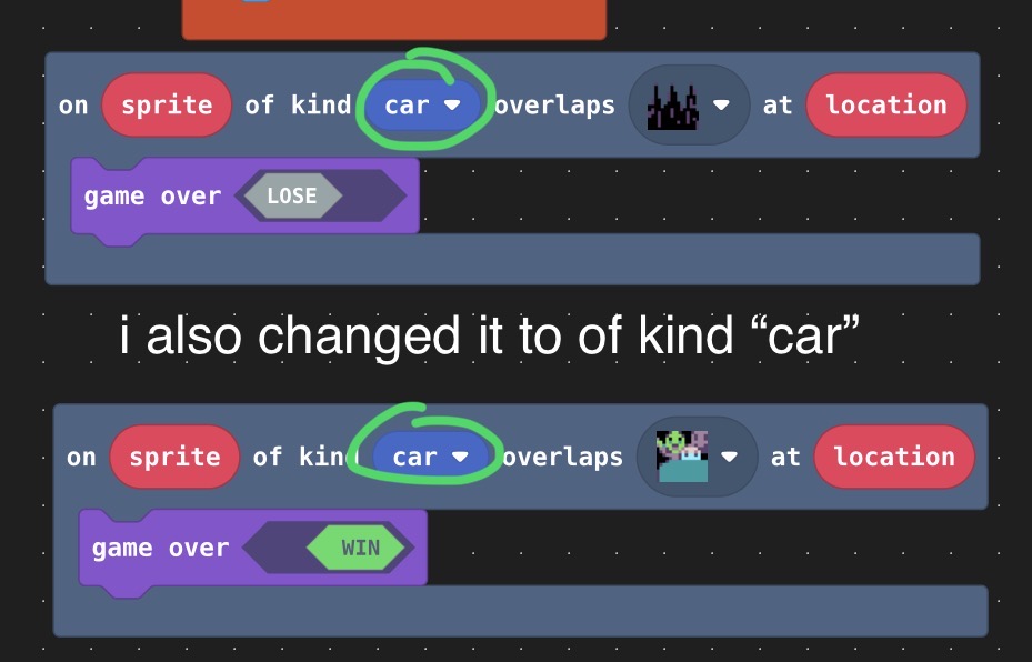 Your code had a few problems. Firstly, (although not in the screenshot), the overlap block said on sprite of kind car, which is wrong because the car’s sprite kind is player. Also (again in the project, not the screenshot), you were using an overlap block rather than a hits wall block, which will not work as the trees are walls.