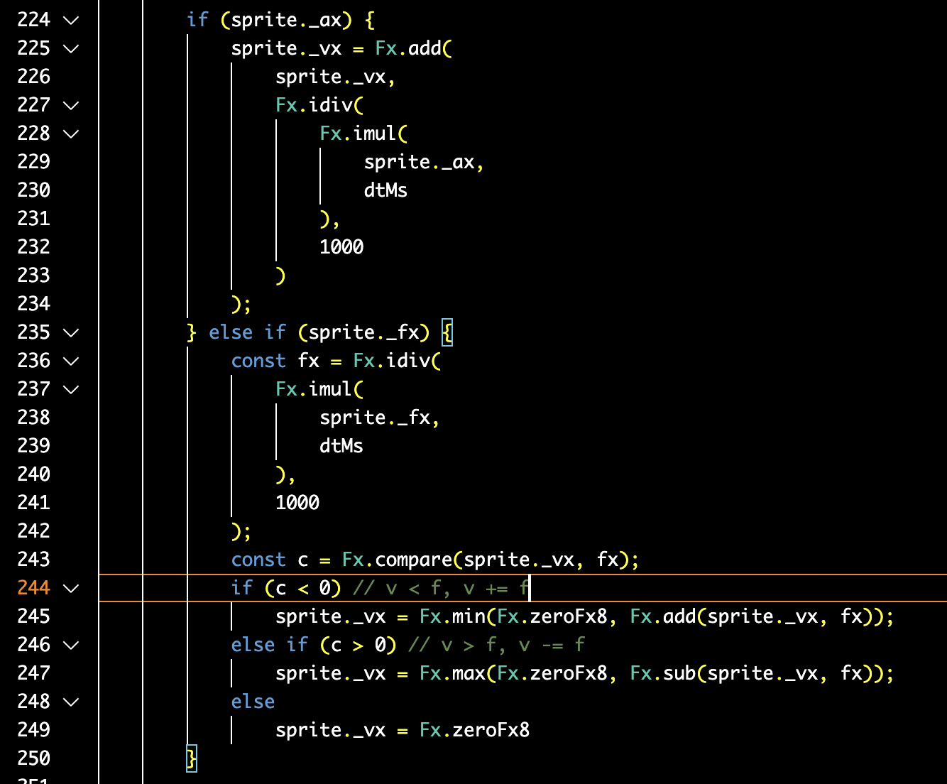 This code is essentially doing the same thing as the acceleration code, which is also in that screenshot. It’s as if you have a loop that applies acceleration in the direction opposite of the player’s movement direction. In fact, here’s a test where one sprite has friction 50, and the other has acceleration -50, and you can see they move the exact same until they reach 0 speed!
