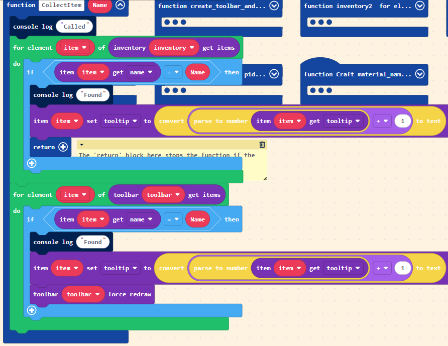 And to fix the error that happens when you try to pick up an item but your existing items are in your hotbar, I made the ‘collect item’ function also check your hotbar if it can’t find the item in your inventory. You also have to force the game to redraw the hotbar if you collect an item to the hotbar, because otherwise it won’t update.
