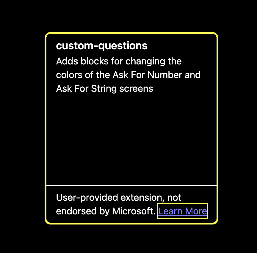 Ok, it’s now an extension! Search WoofWoofCodes/pxt-custom-questions in the extensions search bar, or paste this link: https://github.com/WoofWoofCodes/pxt-custom-questions