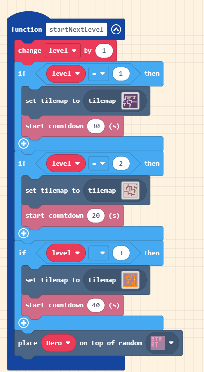 It looks like you are setting a level variable inside of “on start” and then setting the tilemap inside of a “forever” block. While this might work, it makes it difficult to customize the behavior for each level, like setting a different countdown for each one. Instead, let’s refactor this code into a function to make this a little easier to do: