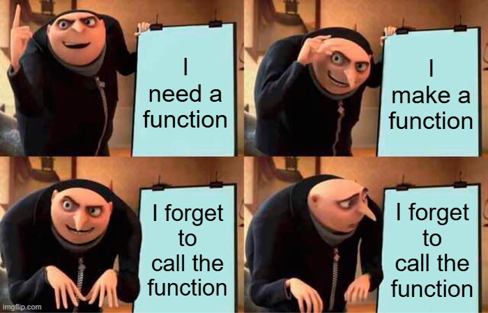 The function one is so true! I be pondering why my code isnāt working and after an hour I finally realize that I just didāt call it.